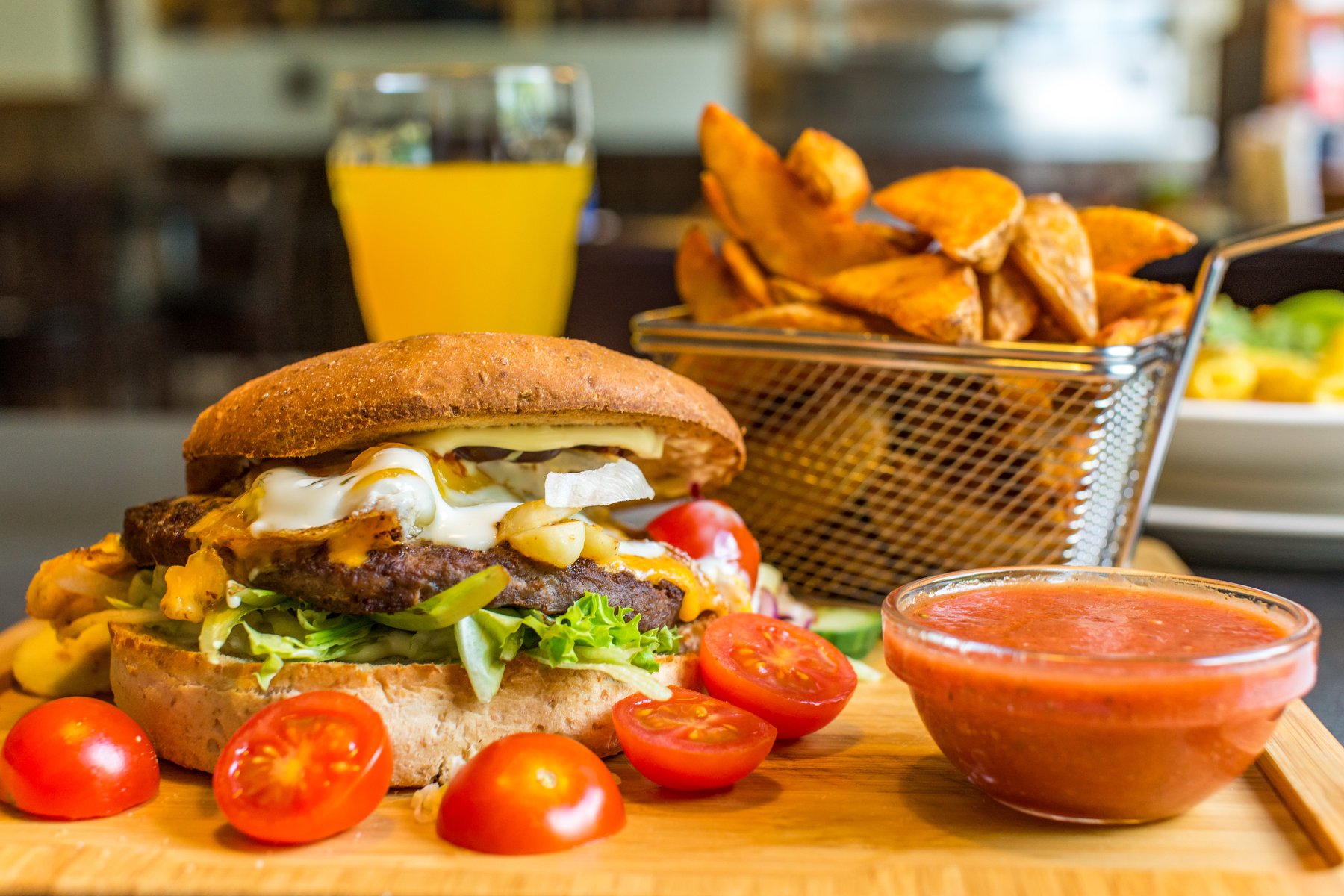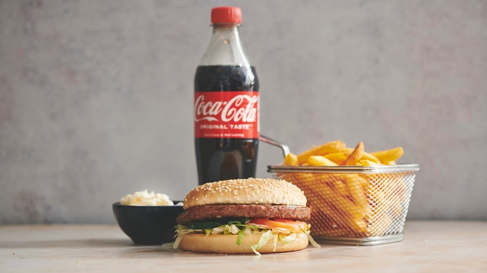 Så kan du vælge en af vores hjemmelavede burgermenuer, som serveres med sprøde pommes frites eller kartoffelbåde, en valgfri dip og en kold sodavand. Vi har også lettere alternativer som friske salater samt en a la carte menu med kødretter, salat og tilbehør – perfekt for dig, der ønsker en mere komplet spiseoplevelse.